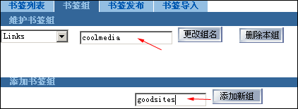 当您点击【书签组】时,将出现如下图所示的界面。在本项中,共分为两部分:维护书签组 添加书签组。是专门针对书签组的各种操作