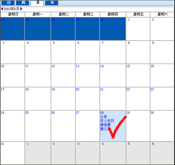 5.在【月】中,你可以看到所选月份的所有日程安排,点相应链接,您会看到你已经设定好的安排。如红色对勾的就是在11月30日安排事务的摘要。