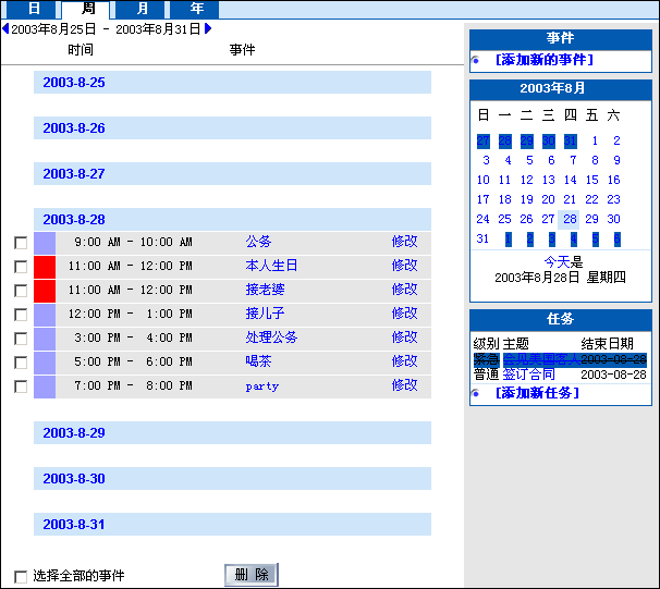 3.在【日】的链接页面中,您可以选择不同的时间段分别设定该时间段的事件,如果你写错了的话,你可以点“修改”来改正。如下图为2000年11月30日一天的时间安排,前面图块为红色的意思是在同一时间段安排了几件事情,蓝色块的意思是在该时间段内只安排一件事情要做。