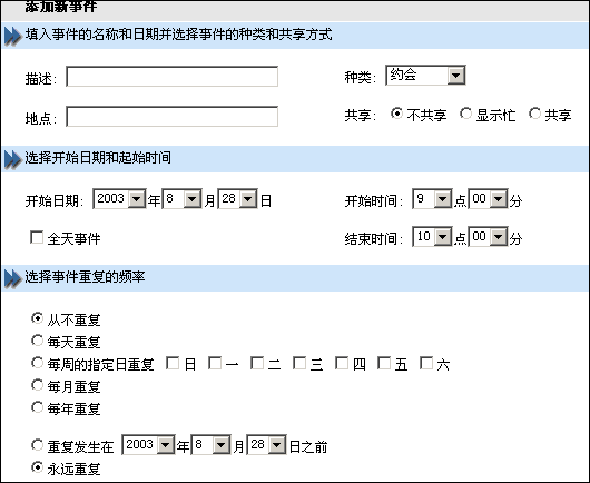 关于全天事件:如果您的新事件在一天内没有确定的时间,也就是说在这一天的任何一个时刻都有可能发生,请选择"全天事件",全天事件将出现在您的【日历—>日】浏览页面的顶部.如果"事件"发生有一段固定的时间内,请在"开始时间"和"结束时间"内填写相应的内容.