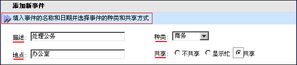 填入事件的名称和日期并选择事件的种类和共享方式: