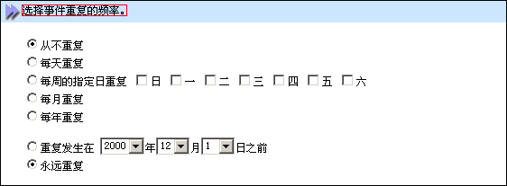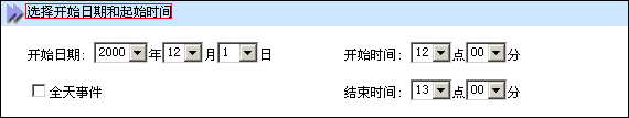 您可以限定本事件开始的日期和开始结束时间,如上图,我们选定发生本事件的日期为2000年12月1日,开始时间:12:00 结束时间:13:00