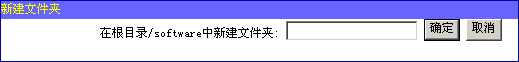 当用户第一次使用网络存储的时候,系统会为用户初始化一个根目录,用户的所有目录都在这个目录中建立。我们的网络存储支持三级目录结构,即根目录-用户目录1-用户目录2这样的目录结构,完全可以满足日常的文件存储需要。您可以在根目录中建立文件夹后将文件分门别类的存放。建立文件夹的方法是点击【根目录】,然后点击【新文件夹】图标,在随后出现的对话框中输入文件夹的名字,可以是中文。例如,当您选择根目录下的software后,再点【新文件夹】按钮,则会出现下图,填入你将要建的新目录就可以了。