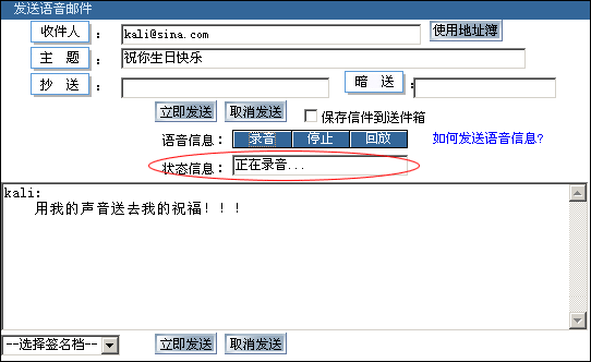 语音邮件与普通邮件在很多方面相似,用户非常容易上手。在发送语音邮件页面中,用户同样可以使用【抄送】、【暗送】、【地址薄】,【签名档】功能。只不过比发送普通邮件少了“粘贴附件”功能,其实您完全可以把您录制的语音信息看作是【附件】,它随邮件文本正文一同发送。