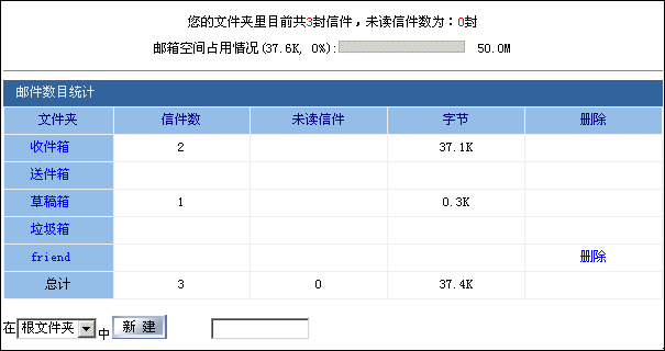 从上图可以看到文件夹的当前状态:您的文件夹里目前共3封信件,未读信件数为:0封。并用图形来表示目前邮箱的空间占用情况。同时在这里还可以建自己个性化的目录(最深目录层为2层),即可以在根文件夹、收件箱、草稿箱、送件箱下建立用户自己的文件目录,垃圾箱下不允许建一个新的文件夹。您可以将已经读过的邮件存放在自己相应的文件目录中。您对自己建立的文件目录有删除的权限,而收件箱、草稿箱、送件箱、垃圾箱则是系统缺省设置,是不可删除的。