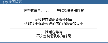 当您点击 “POP3收信”时,系统就会按您的设置来收取信件,系统会弹出一个界面来提示您系统正在收取信件,此过程可能 最多持续5分钟。