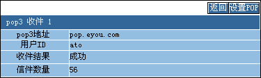 当收完信件后,系统会自动转入一个页面,报告您的POP3收件设置的收件情况。收取到的信件全部保存 在收件箱中 。项目包括:pop3地址、