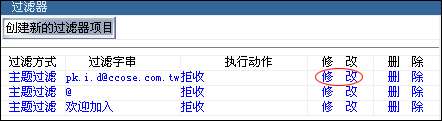 在“过滤器”页面,如图一所示,点击要修改的过滤项目的修改链接,在如图二所示页面,全部修改好后点击【确定】即可。如果放弃修改此过滤选项可点击【取消】。