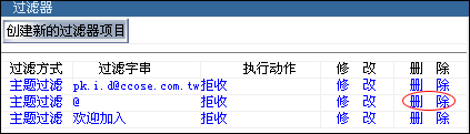 过滤器的删除:点击【过滤器】页面中的所要删除的过滤器的【删除】即可将该过滤器删除。如下图所示可将第一项过滤器删除。