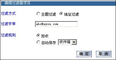 例如:当用户希望拒收user@eyou.com 的信件,并将所有来自pop@eyou.com 的信自动保存到收件箱中的"friend"文件夹中(用户自建文件夹)。可以将过滤器第一项设置成【过滤方式】为【地址过滤】,